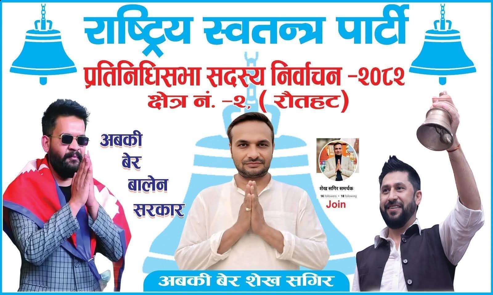 आसन्न प्रतिनिधि सभा सदस्य निर्वाचनअन्तर्गत रौतहट निर्वाचन क्षेत्र नं. २ मा राष्ट्रीय स्वतन्त्र पार्टी (रास्वपा) का उम्मेदवार शेख सगिरले आफूले अन्य कुनै उम्मेदवारलाई समर्थन गरेको भन्ने हल्ला निराधार र कपोलकल्पित भएको स्पष्ट पारेका छन।