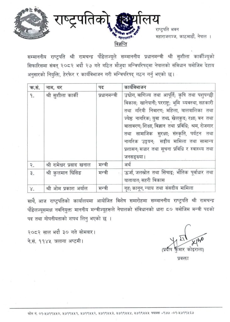 जेनजी आन्दोलनका क्रममा आगजनी भएपछि शीतल निवास पनि बस्न नमिल्ने अवस्थामा पुगेको थियो । त्यसैले गत शुक्रबार प्रधानमन्त्री सुशीला कार्कीको शपथ राष्ट्रपति निवास भित्रै भएको थियो ।आज चाहिँ खण्डहर कार्यालय बाहिर पाल टाँगेर मन्त्रीको शपथ कार्यक्रमको व्यवस्थापन मिलाइएको हो ।