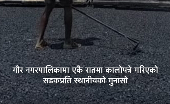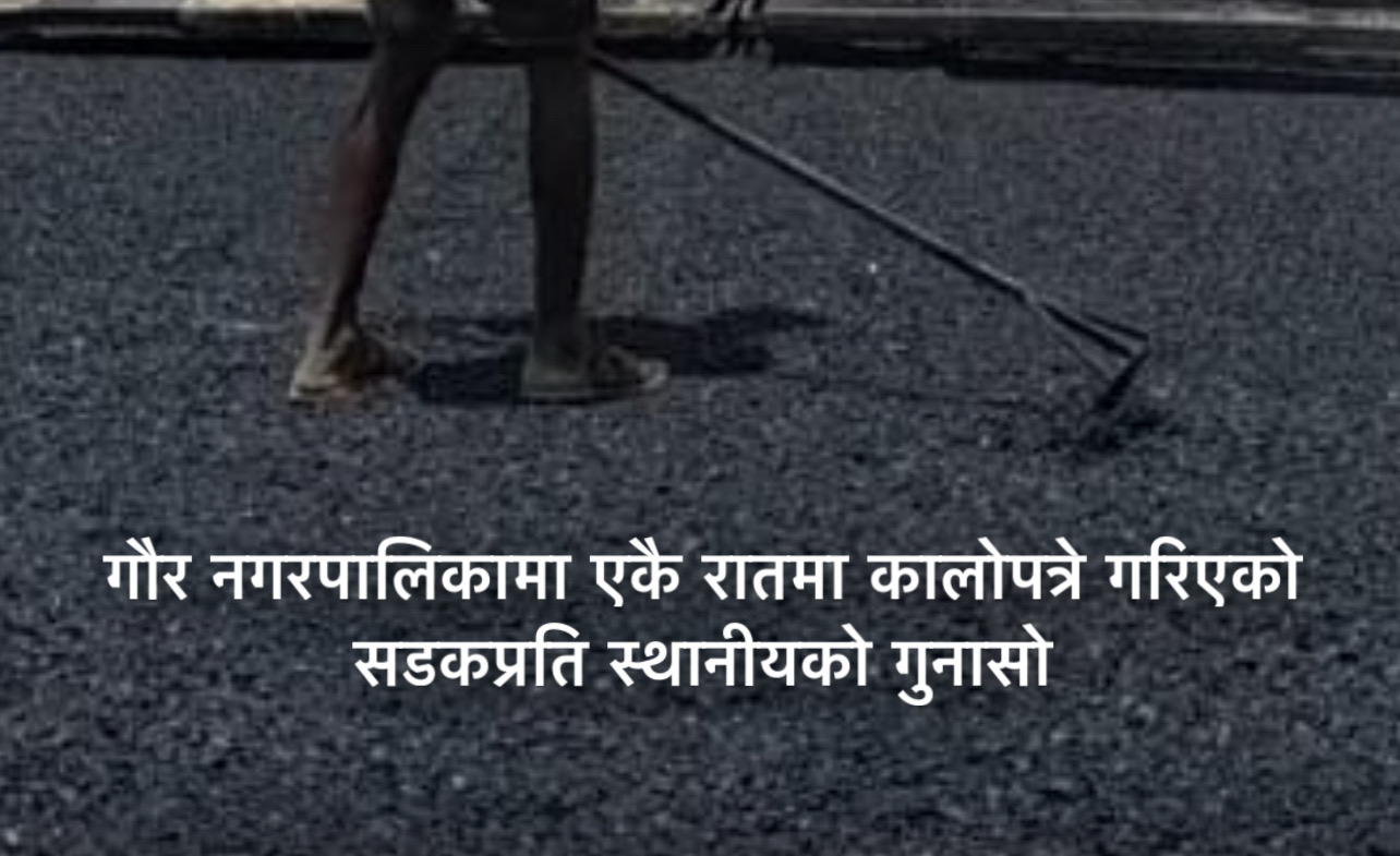 सोनु कुमार महतो । गौर, अषाढ २५ – गौर नगरपालिकामा एकै रातमा हतारहतरमा कालोपत्रे गरिएको सडकप्रति स्थानीयवासीले असन्तुष्टि जनाएका छन्। विकाश र समृद्धिको नाममा जनताको आँखामा छारो हालिएको भन्दै उनीहरूले गुनासो व्यक्त गरेका छन्।
