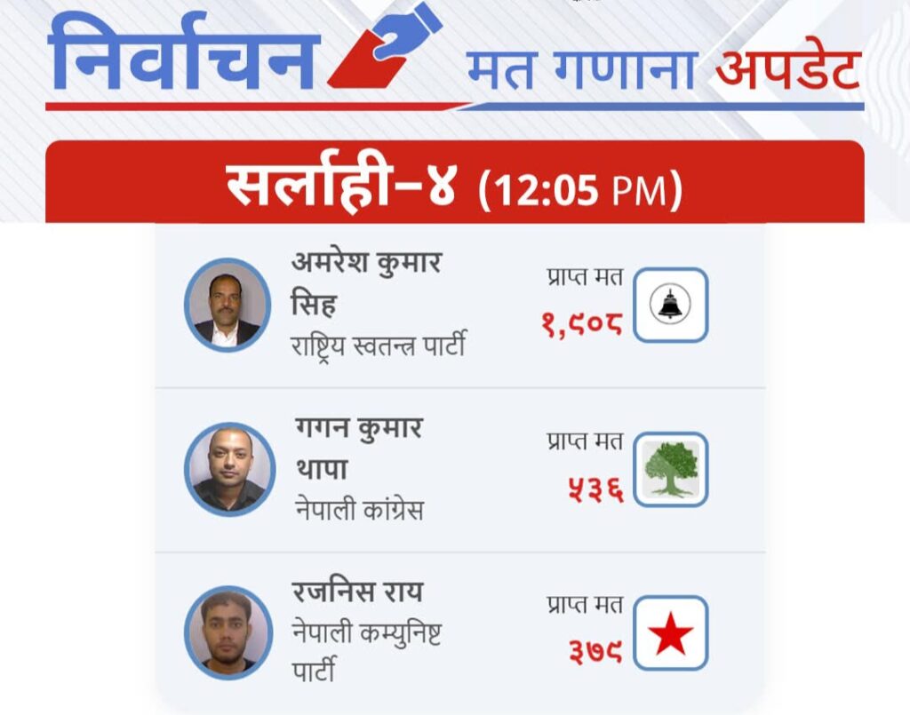 Home Uncategorized ताजा मत परिणाम : फागुन २२ गते, बिहान १२:०० बजे Uncategorized ताजा मत परिणाम : फागुन २२ गते, बिहान १२:०० बजे By अनलाईन कान्तिपुर - 168 0 RELATED ARTICLESMORE FROM AUTHOR राजपुरमा पालिकास्तरीय किशोरी मेयर कप क्रिकेट सम्पन्न, वडा नं. ६ ले जित्यो उपाधि सर्लाही–४ मा ठूलो चुनावी उलटफेर देखिएको छ। सर्लाही क्षेत्र न – ४ (३०६९) मतगणना प्रजातन्त्र दिवसमा नारायणकाजी श्रेष्ठद्वारा शुभकामना, लोकतन्त्र र संविधान रक्षाको आग्रह देशभर १ करोड ८९ लाख ३ हजार ६८९ मतदाता, कुन क्षेत्रमा कति ? (सूची) यसपालि १० हजारको मतान्तरले निर्वाचनमा विजयी हुन्छु-किरण साह भारतको नालन्दा खुल्ला विश्वविद्यालयमा अन्तर्राष्ट्रिय मातृभाषा पत्रकारिता सम्मेलन सोमबार सम्पन्न चिसो बढ्दै जाँदा गरुडा नगरपालिकाद्वारा दाउरा वितरण। एउटै सेवामा फरक–फरक शीर्षकमा दोहोरो शुल्क , निजी अस्पतालको बिलिङ प्रणालीमाथि गम्भीर प्रश्न LEAVE A REPLY Cancel reply Please enter your comment! Please enter your name here You have entered an incorrect email address! Please enter your email address here Save my name, email, and website in this browser for the next time I comment. सिफारिस राजपुरमा पालिकास्तरीय किशोरी मेयर कप क्रिकेट सम्पन्न, वडा नं. ६ ले... अनलाईन कान्तिपुर - April 16, 2026 0 सर्लाहीमा मोटरसाइकलको ठक्करबाट ६ वर्षको बालक गम्भीर घाइते अनलाईन कान्तिपुर - April 13, 2026 0 सर्लाहीको हरिपुर्वा नगरपालिका कार्यालयमा युवाहरुद्वारा बिरोध प्रदर्शन अनलाईन कान्तिपुर - April 13, 2026 0 सर्लाहीमा श्रोत नखुलेको पैसा सहित मानिस पक्राउ अनलाईन कान्तिपुर - April 11, 2026 0 सर्लाहीको रामवनमा दुई युवती झुन्डिएको अवस्थामा फेला अनलाईन कान्तिपुर - April 1, 2026 0