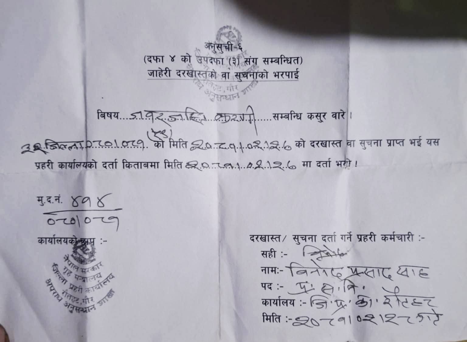 शुरुआती प्रयासमा इलाका प्रहरी कार्यालय राजपुर फरहदवाले चासो नदेखाएपछि पीडित जिल्ला प्रहरी कार्यालय गौर पुगिन्। त्यहाँ तत्कालीन प्रहरी उपरीक्षक दिलीप घिमिरेको निर्देशनमा मुद्दा दर्ता त भयो, तर आरोपी खुर्सैद खाँ पैठान एक वर्षसम्म फरार रहे। त्यो अवधिमा पीडितको घरमा आरोपीका मान्छेहरू ६ देखि ८ लाख रुपैयाँ लिएर पुगेर दबाब दिने काम गर्दै आएका थिए। तर पीडित र उनका परिवारले “पैसा होइन, न्याय चाहिन्छ” भन्ने अडानमा कायम रहे।
