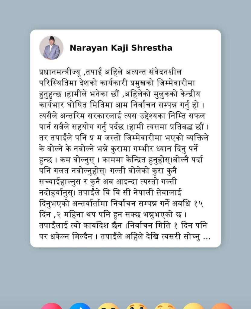 सामाजिक सञ्जाल फेसबुकमा उनले भनेका छन्, ‘अन्तर्वार्तामा निर्वाचन सम्पन्न गर्ने अवधि १५ दिन, २ महिना थप पनि हुन सक्छ भन्नुभएको छ । तपाईंलाई त्यो कार्यादेश छैन । निर्वाचनको मिति १ दिन पनि पर धकेन्न मिल्दैन । तपाईंले अहिले देखि नै त्यसरी सोच्न र सार्वजनिक समेत गर्नु घातक साबित हुन सक्छ ।’
