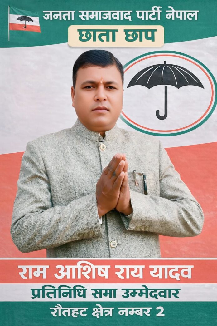 उम्मेदवार रामअशिष राय यादवले भन्छन् : रौतहट निर्वाचन क्षेत्र नं .२ का जनता सोझा भएका कारण आजसम्म यो क्षेत्रमा शिक्षा ,स्वास्थ्य तथा भौतिक पूर्वाधारका कामहरु हुन सकेको छैन ।जनता पिडामा छन् तर नेताहरु काठमाडौंमा मौज गरिएका छन्। म आफ्नो उम्मेदवारी केवल जनताको हकहित र भलाईको लागि मात्र दिएको छु।